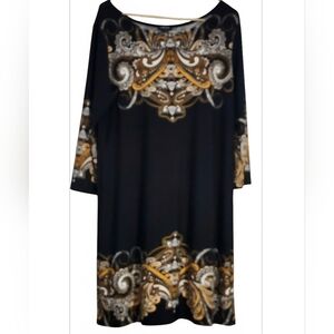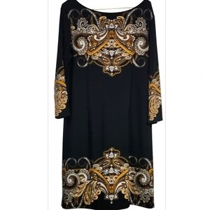 Chic long sleeve dress with bold gold and brown designs. Perfect for stylish occasions.