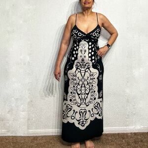 Small black and white dress by Forever in excellent preowned condition. Approximately 63” length, 16” bust, 14” waist.