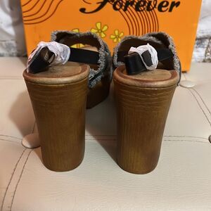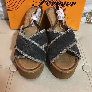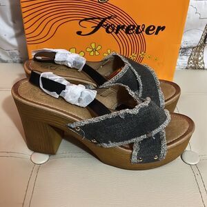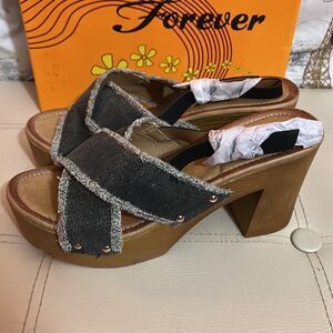 These shoes are awesome! Denim crisscross with a chunky wooden heel. It’s a platform, it’s a clog, it’s both! This is brand new in box, size 9 only.