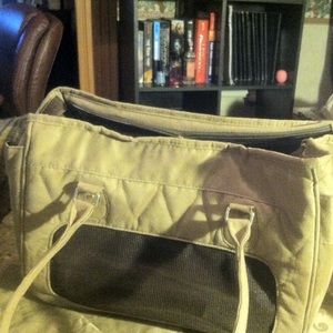 "Friends Forever" brand new rich quilted velour sand toned dog carrier with comfortable dye to match shoulder straps. Chocolate brown mesh zipper color avail pull zipper and padded removable bottom to provide comfort for your wonderful pet + generous front and back pockets for other essential pet needs. ☀︎ 14.5in x 7in x 11in (37cm x 18cm x 28cm) ☀︎