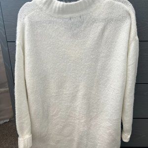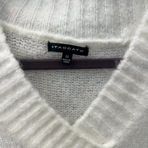 Knit sweater features a thick ribbed v-neckline, long sleeves accented by dropped shoulders, and a ribbed hemline. Model is wearing a small. • 75% Acrylic 22% Polyester 4% Nylon • Dry Clean Only • Unlined • Imported