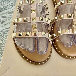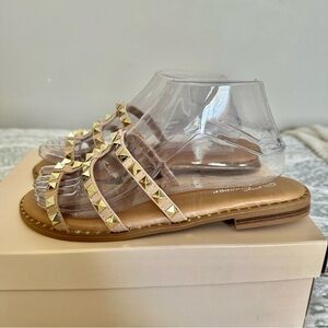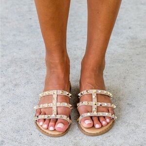 Chic tan sandals featuring gold studded straps. Ideal for everyday style.