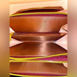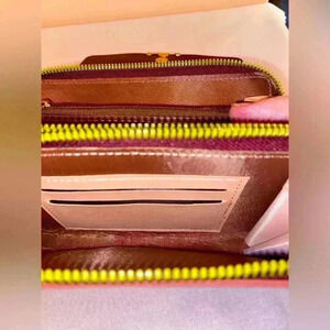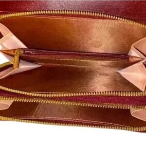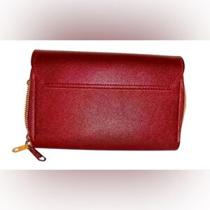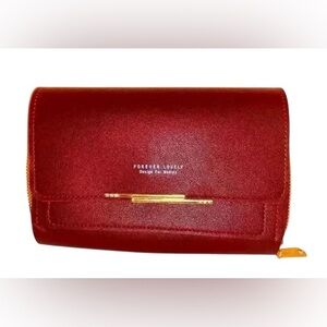 Really cute Forever Lovely Design For Madley clutch in burgundy. Hardware is in gold tone. This clutch does not have a strap with it but it does have hoops to attach one. However, this clutch can also serve as a very nice wallet with lots of storage and organization features. Other than missing strap, this clutch is in new, unused condition, without any tags.