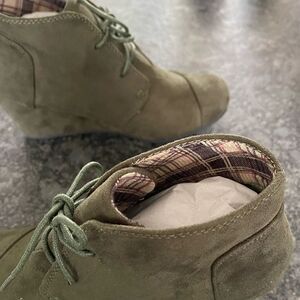 Forever Suede Ankle Booties Khaki wedge heel, tie closure, plaid lining BNWOB