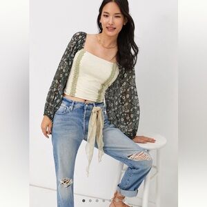 Chic blouse with floral puff sleeves. Cream body with green floral design. Perfect for any occasion. Perfect condition. No flaws. Such a sweet blouse with beautiful little details. Laces up the back. Fluttery bell sleeves that are tight at the cuff. Size extra small, but it fits a bit loose more like a small, would fit a medium.