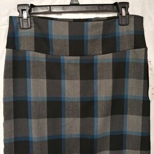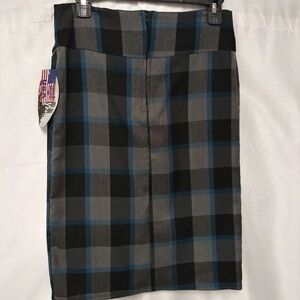 Forever Young Women's Blue/Black/Gray Plaid Pencil Skirt. Zipper Back Closure. Measurements approx. Flat Lay. Waist: 14, Hips: 16, Length: 24 Size Large NWT Color May Vary Due To Lighting.