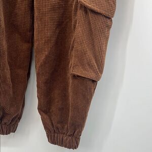 These brown cargo pants from Forever 21 offer a relaxed fit with a contemporary urban style. Crafted from a sturdy material, they are perfect for casual wear and feature a jogger-style appearance with elastic cuffs. Drawstring closure. Corduroy feel but not heavy. 15” waist laying flat and a 27.5” inseam. 90% polyester and 10% nylon.