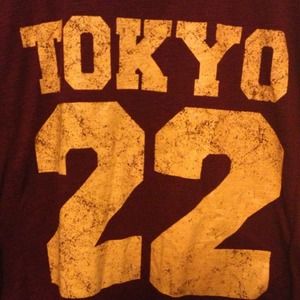 This is a burgundy top with yellow gold letters saying Tokyo 22. This top is super breathable and comfy! Size XL but could easily fit 2X. Slightly worn