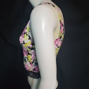 Forever 21 pink, yellow, black, and green floral patterned cropped tank top with black lace detailing at the bottom.