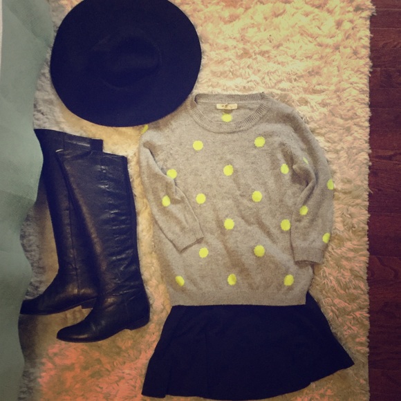 Gray sweater with neon yellow polka dots all over front and back. Sleeves stop at mid arm. Size S and may fit size 4 or 2. Good condition and only worn it a few times. Looks great with a black skirt and boots or can go casual with jeans and a pair of white converses