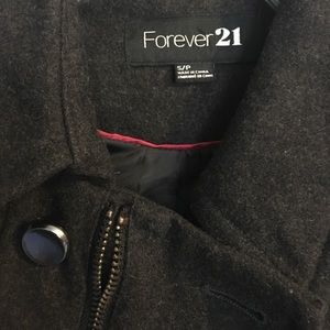 Dark Grey, double breast buttoned Wool Jacket. Very warm, and a slightly cropped (the bottom of the jacket lands right above the waistline). 62% wool, 24% polyester, 7% nylon, 4% rayon, and 3% acrylic. The lining is 100% polyester.