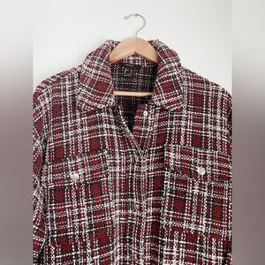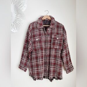 Forever21 Plaid Check Shacket Oversize Shirt Tweed Red Jacket Boucle Fray Fringe