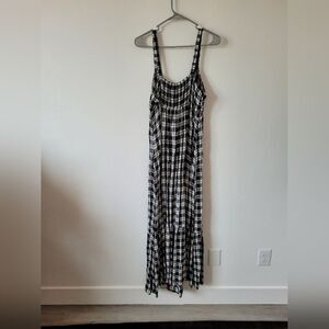 Super cute maxi dress in a black and white Buffalo Plaid print with a smocked bodice and empire waistline with a tiered ruffle bottom hem and side zip closure. Very flattering and versatile. 100% Rayon. Great condition. Size 2X, measures approximately 57 inches long 20 inches underarm to underarm laid flat 18 inch waist laid flat across.