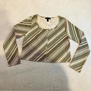 A knit top featuring an allover striped pattern, scoop neckline, long sleeves, and faux button-front closures.