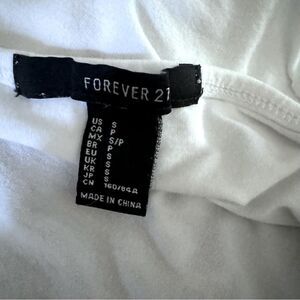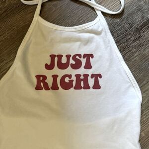 Cute graphic halter top with words Just Right across chest. Raw cropped hemline. Tie neck. No fabric tags but feels like a cotton blend. In great preowned condition. Forever 21 Size Small