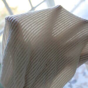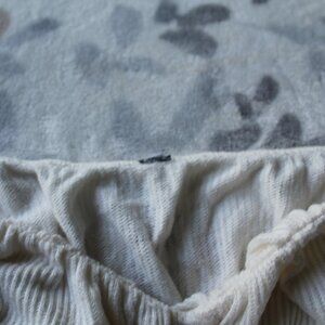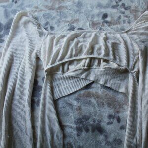 Cute, casual cotton crop top with long ties to tie around the waist. Big, comfy off-shoulder bell sleeves made of a very soft, warm material. A few loose strands and missing size tag.