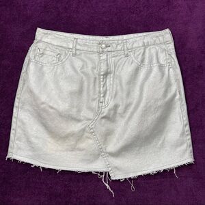 Super cute pre-owned Forever 21 Metallic Silver Coated Cutoff Denim Jean Skirt Size Large. No stains or holes. Please ask all questions before purchasing.