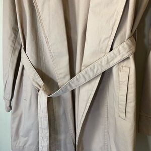 Classic short trench jacket style. Light weight cotton, no buttons. Tie at waist to close. Pockets in front and button cuffs. Transitional layering piece for Spring & Fall.