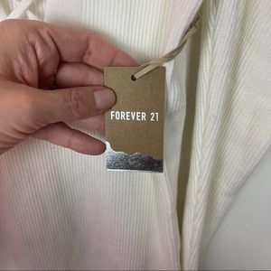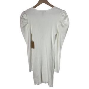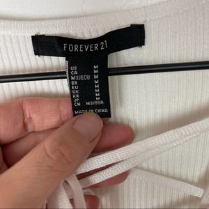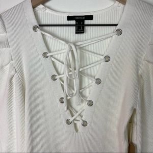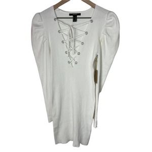 Forever21 White Ribbed V-Neck Lace Up Puff Shoulders Bodycon Mini Dress Sz M NEW