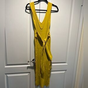A ribbed knit midi dress featuring a self-tie belt, V-neckline, 2 side slit, bodycon silhouette, and sleeveless cut.