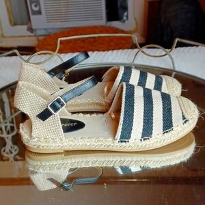 ckean these are so cute unique white &blue canvas berlap encloed sandals .6M