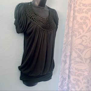 Cute black boho tunic style top. Lots of detail at neckline. I’ve never really been able to figure the exact color on this top. Sometimes it looks like a dark olive green as opposed to black. Short capped sleeves. Wide waistband. In great used condition. 100% rayon fabric. Twenty One/Forever21 Size Small