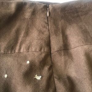 Features: Beautiful embroidery and beads along the front and back edge of this fun A-line skirt. Hidden side zipper and hook/eye closure. Skirt is fully lined. Fabric is a very soft suede like material.