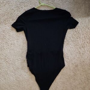 Foreve 21 Black Snap Bottoms Wrap Front (Cleavage showing) bodysuit with short sleeves. Ribbed Knit. Such a versatile piece can be worn with anything! Size small. Excellent condition.