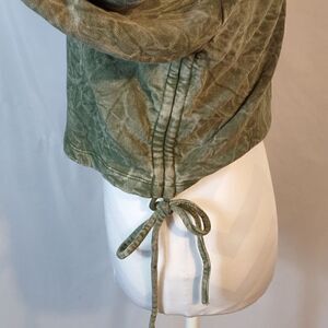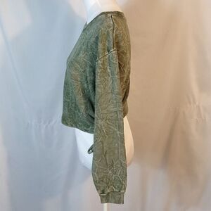 This green marbled long sleeve Forever 21 cropped pullover sweatshirt is a size Large with a pit to pit measuring 22" and a length of 17". It has a ribbed crew neck and cuffs. Gathers and ties on each side. 89% cotton 11% polyester and machine washable. In excellent pre-loved condition. All offers are welcome.