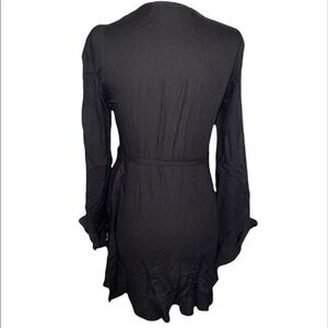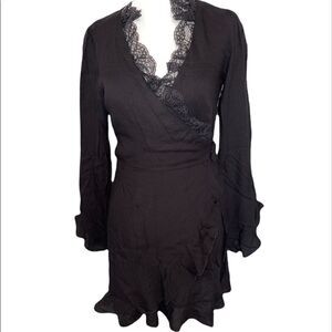 Adorable little black faux wrap mini dress with ruffle hem and ruffle cuffs (lace was added in by me, and can be removed), from Forever 21, size small.