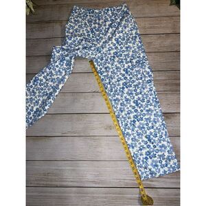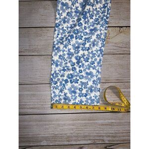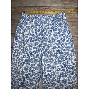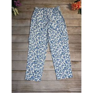 A pair of woven utility pants featuring an allover floral print, slant front pockets, and a high rise.
