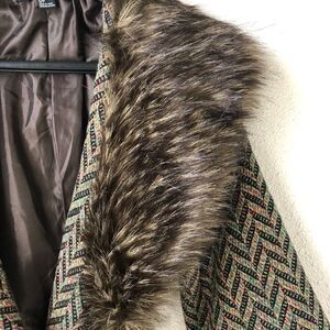 Super cute Forever 21 coat featuring a plaid design and faux fur collar. It’s in good used condition.