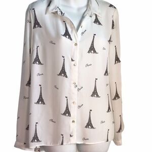 Forever 21 Paris Eiffel Graphic Print Tower Button Down Blouse White S