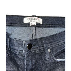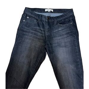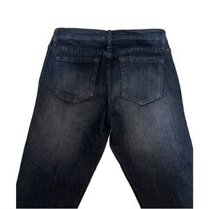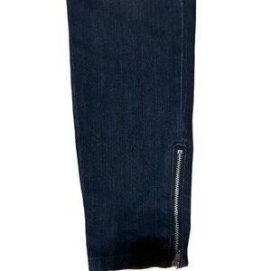 Black skinny jeans. Side zip hem. Five pockets. Belt loops. Button and zip closure. 59% cotton/34% polyester/6% rayon/1% spandex. Size: 28. Preowned in good condition.