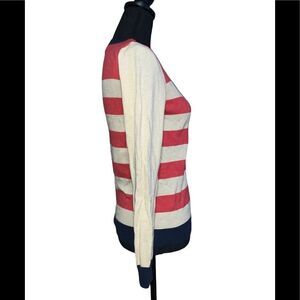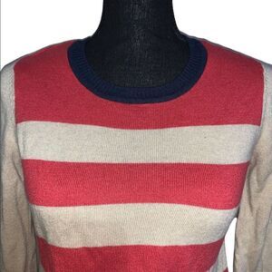 Burnt orange, tan and dark blue stripe sweater. Crewneck. Long sleeves. 68% acrylic/24% nylon/10% angora. Size: small. Preowned in good condition.