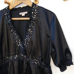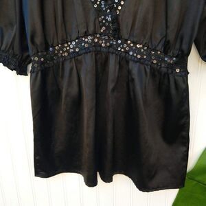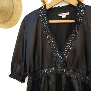 Forever 21 Vintage Y2K 90s Black V Neck Top Size L Silky Sequins Puff Sleeve