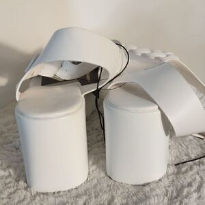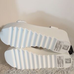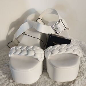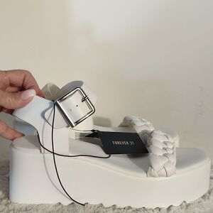 These New with tags White braided faux leather women's wedge sandals are a size 9. They have a silver buckle and cushioned insoles for comfort. All offers are welcome.