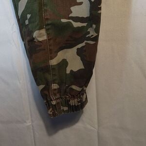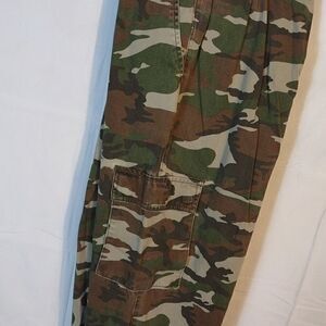These green and brown camo denim Forever 21 cargo pants are a size Small with an elastic waist measuring. 14" laying flat an inseam of 27" and a front rise of 12". It has 4 pockets with the two leg pockets having snap closures. In excellent condition. All offers are welcome.
