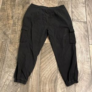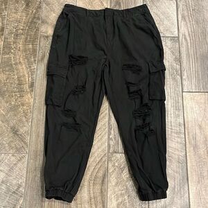 Black distressed cargo pants. 100% cotton. Waist (flat) 18” Rise approx 13” Inseam approx 26.5”