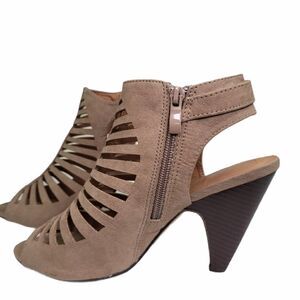 GUC peep toe sandal suede like material with zipper entry and adjustable buckle. Taupe color.