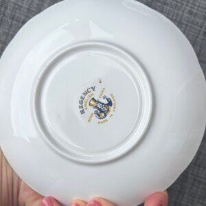 It was designed by Regency Bone China of England decades ago. These blue blossoms are on a snowy white glossy background. Made in England