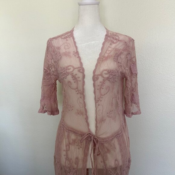 Forgotten Grace cardigan • pink lace duster • tie front topper • short sleeve lace cardigan • lightweight layering piece • romantic lace cardigan • women’s spring summer topper • delicate lace overlay • feminine chic layering • L/XL cardigan women