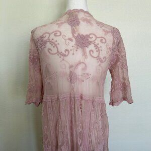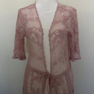 Forgotten Grace Cardigan Lace Short Sleeve Topper Duster Pink Tie Front Romantic