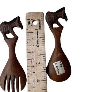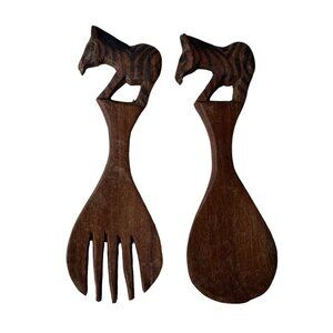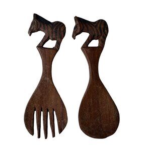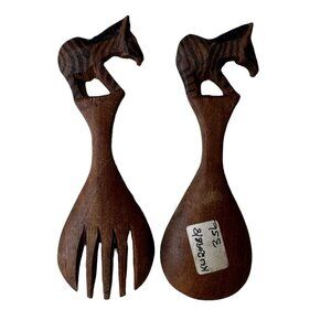 This 4" tall vintage spoon and fork set is wooden hand carved by an African artisan. These are zoomorphic with zebras carved on the handles with cut out pleasing curved shapes. They are brown in color with hand painted black stripes to give proper character to the zebra animal. These functional yet decorative items are in good pre owned clean condition with some variability within the natural wood matrix along with some use wear, no breakage issues. These have been residing as decor items in a wealthy Dallas Texas estate for many decades. Please review the pictures for more details and size measurement information, thank you.