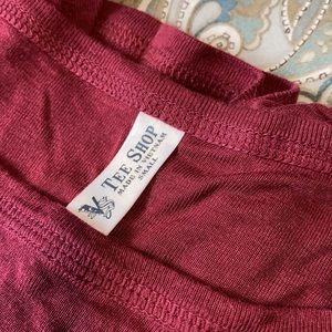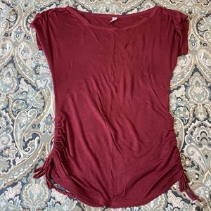 Form fitting, ruching detail at shoulders with slight batwing for relaxed fit along the arms. Scooped hem with tie ruched sides. Boat neck. Burgundy color.
