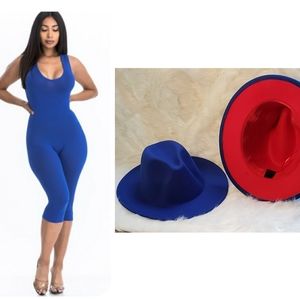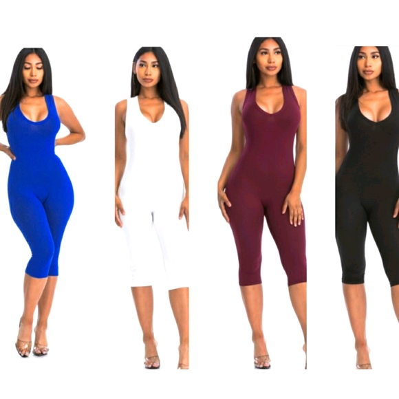 Available in blue,white, burgundy,black. No sleeves calf length jumpsuit. Fabric is a polyester and spandex blend.