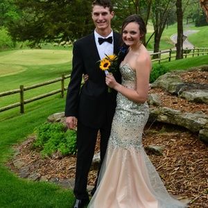 Gorgeous champaign colored, beautifully sequined prom dress. Worn once. Retail $450. Was a size 6, had taken in to a 4.