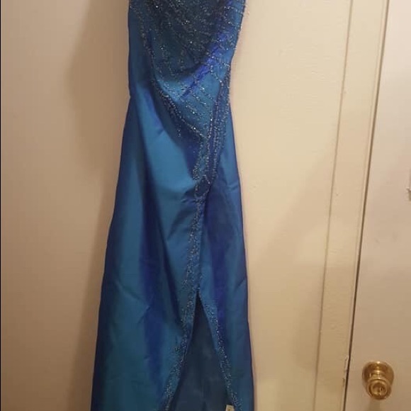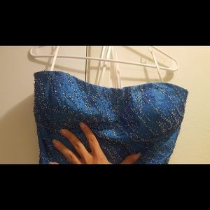 Royal blue strapless formal. Beautiful sequin work. Tag says 12 but I had it altered to fit more like a 10. Almost has an iridescent look to it.