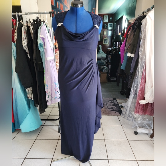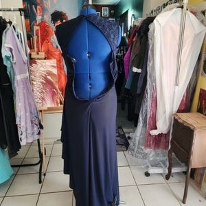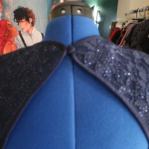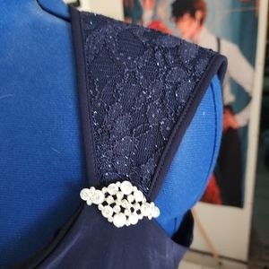 navy formal zips up back and buttons at neck with rhinestone embellishments on shoulders, worn once on cruise ship