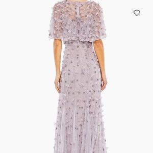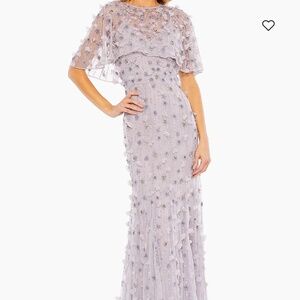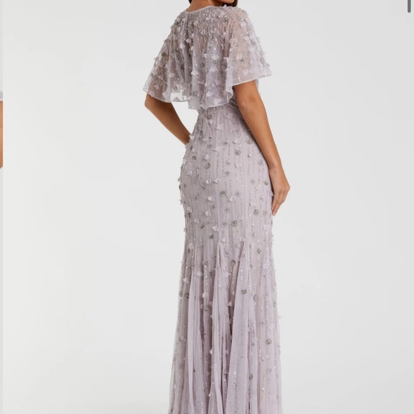 Command attention in our Embellished Illusion Cape Sleeve Trumpet Gown, the ultimate show-stopping choice for your next formal event. This gown features intricate beading, all-over floral 3D appliqué details, rhinestone embellishments, and dramatic illusion cape sleeves, creating an unmatched blend of elegance and glamour. Perfect for galas, awards ceremonies, or red carpet events.